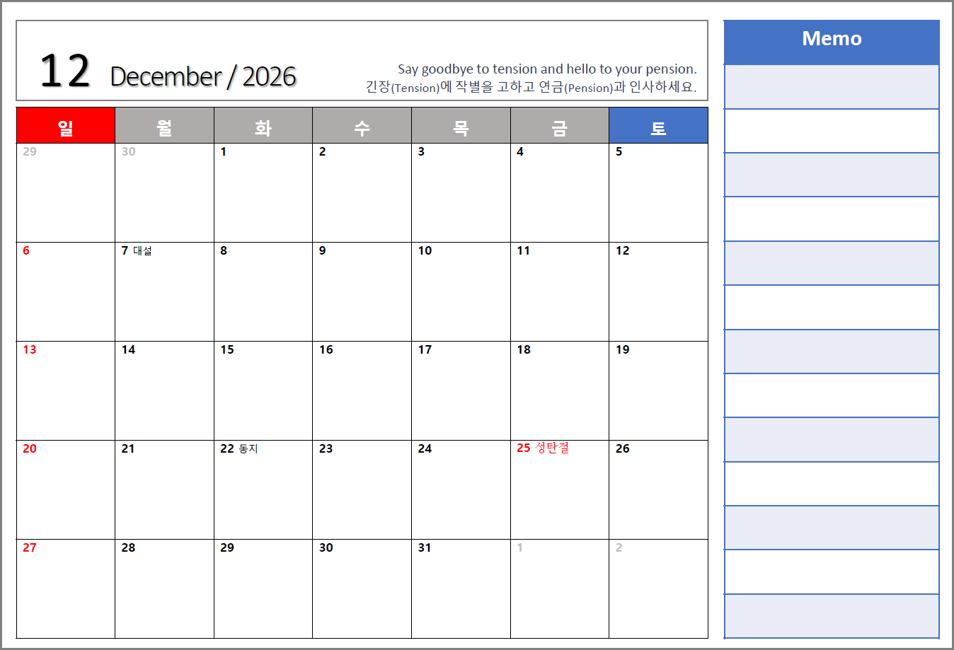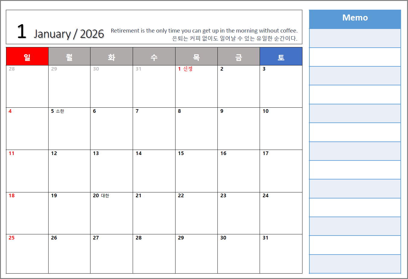 매년 달력을 만들어서 사용하고 있는데, 올해도 2026년 달력을 만들었습니다.