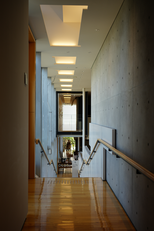 기존의 대학 건물을 리모델링하여 만든 공간인데, 외부와 내부에 겐고 구마 특유의 목재 구조가 눈에 들어옵니다.