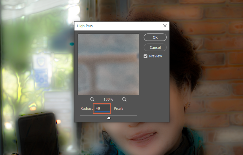 선택창에서 Radius값을 40 정도로 선택합니다.