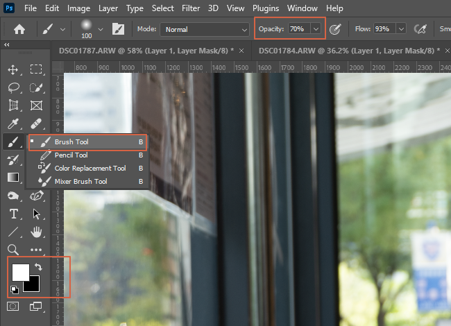 툴바에서 전경색을 흰색, 브러시를 선택하고 Opacity를 70% 정도에 맞춥니다.